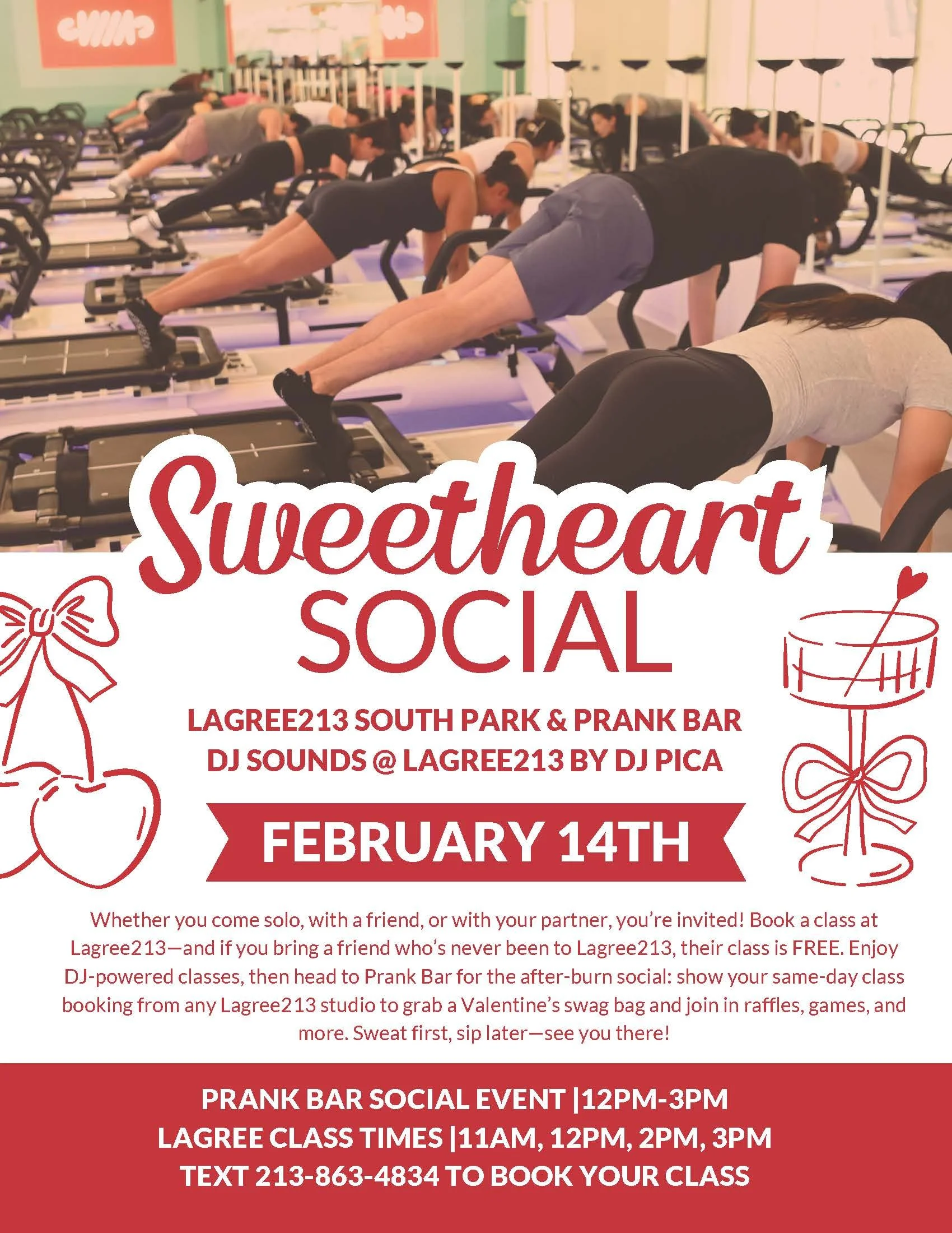 Book a class at Lagree213—and if you bring a friend who’s never been to Lagree213, their class is FREE. Enjoy DJ-powered classes, then head to Prank Bar for the after-burn social: show your same-day class booking from any Lagree213 studio to grab a Valentine’s swag bag and join in raffles, games, and more.